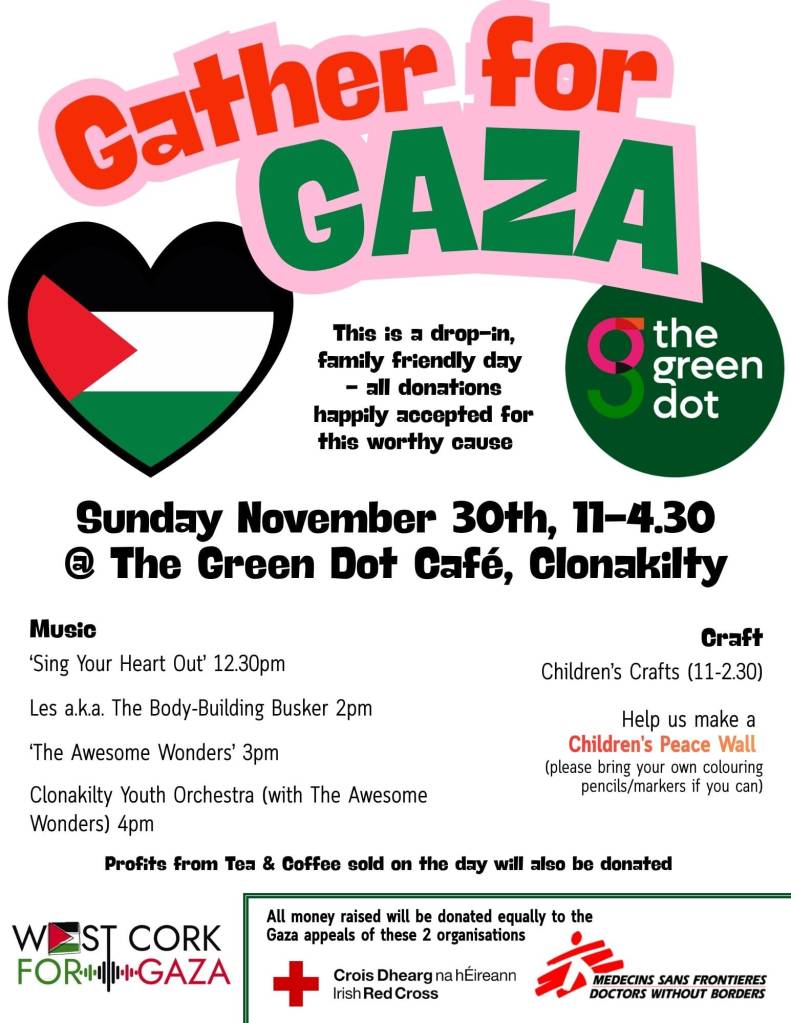 As part of West Cork for Gaza, The Green Dot is very proud to host a family-friendly day of crafts, community art and music from local youth choirs and groups. This will be a drop-in day with people encouraged to donate what they can. Details to follow closer to the day.
